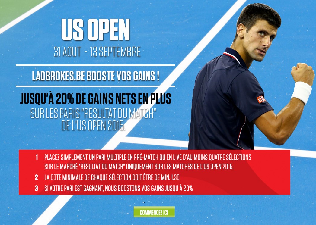 Pour l’US Open 2015, le site de jeux et de paris Ladbrokes.be offre jusqu’à 20 % de gains supplémentaires pour tous les paris « Résultat du match » placés sur les rencontres de ce grand tournoi. Cette promo permet à chaque joueur d’empocher à hauteur de 1 000 € en plus de ces gains.